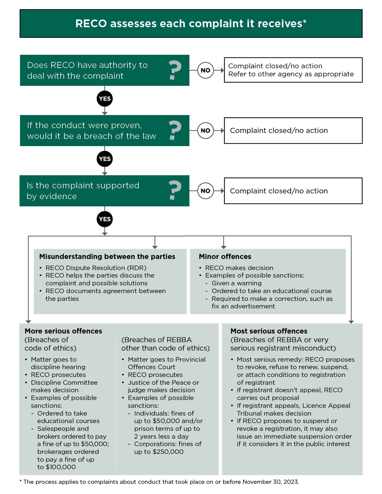Most often, provincial offences prosecutions relate to matters involving trading in real estate unlawfully. However, RECO may lay charges and pursue prosecution on some other matters. An individual convicted in court is subject to fines of up to $50,000 and/or prison terms of up to two years. Corporations are subject to fines of up to $250,000.